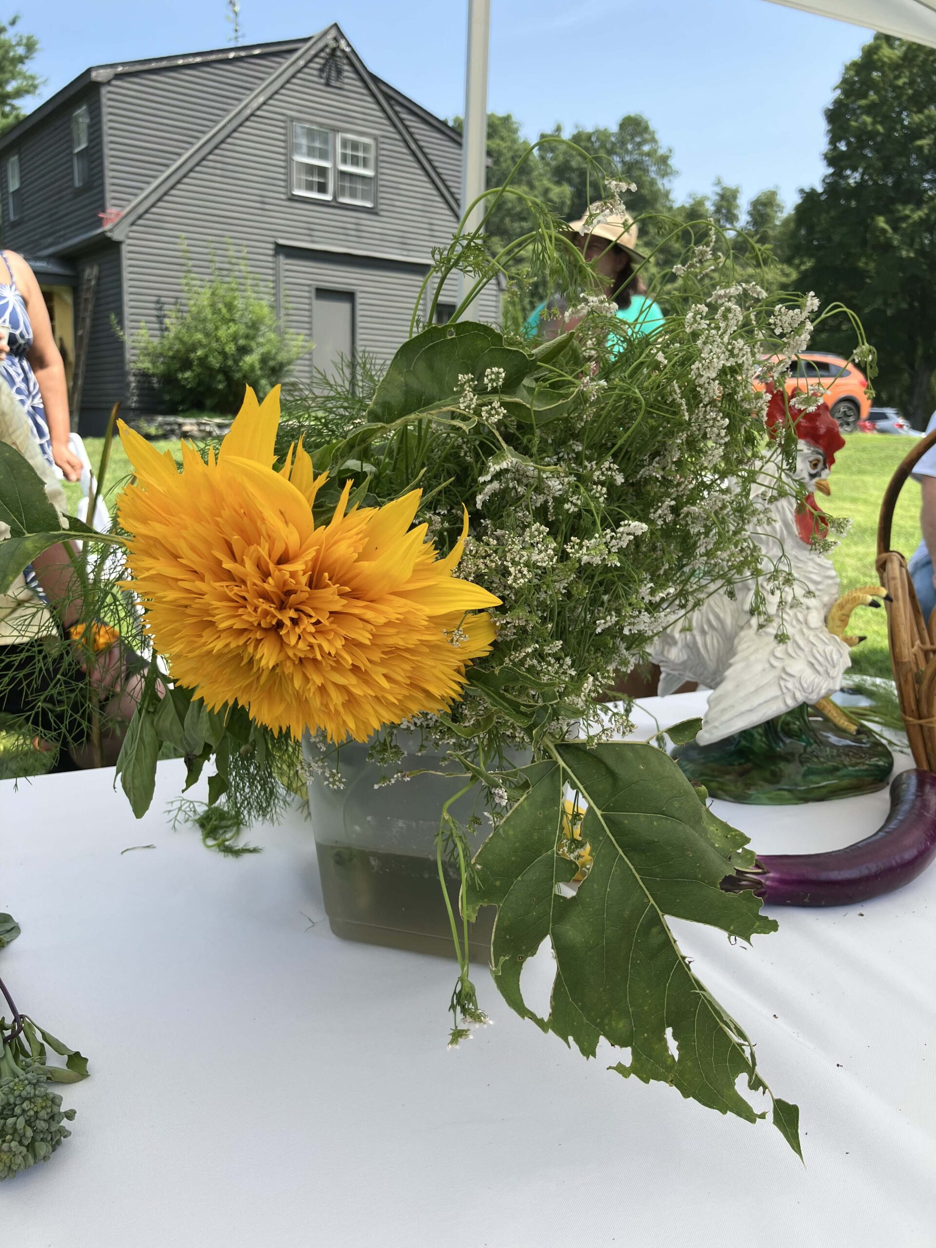 A welcoming container of herbs and a sunflower perfectly represents the bountiful nature of this enchanting environment!