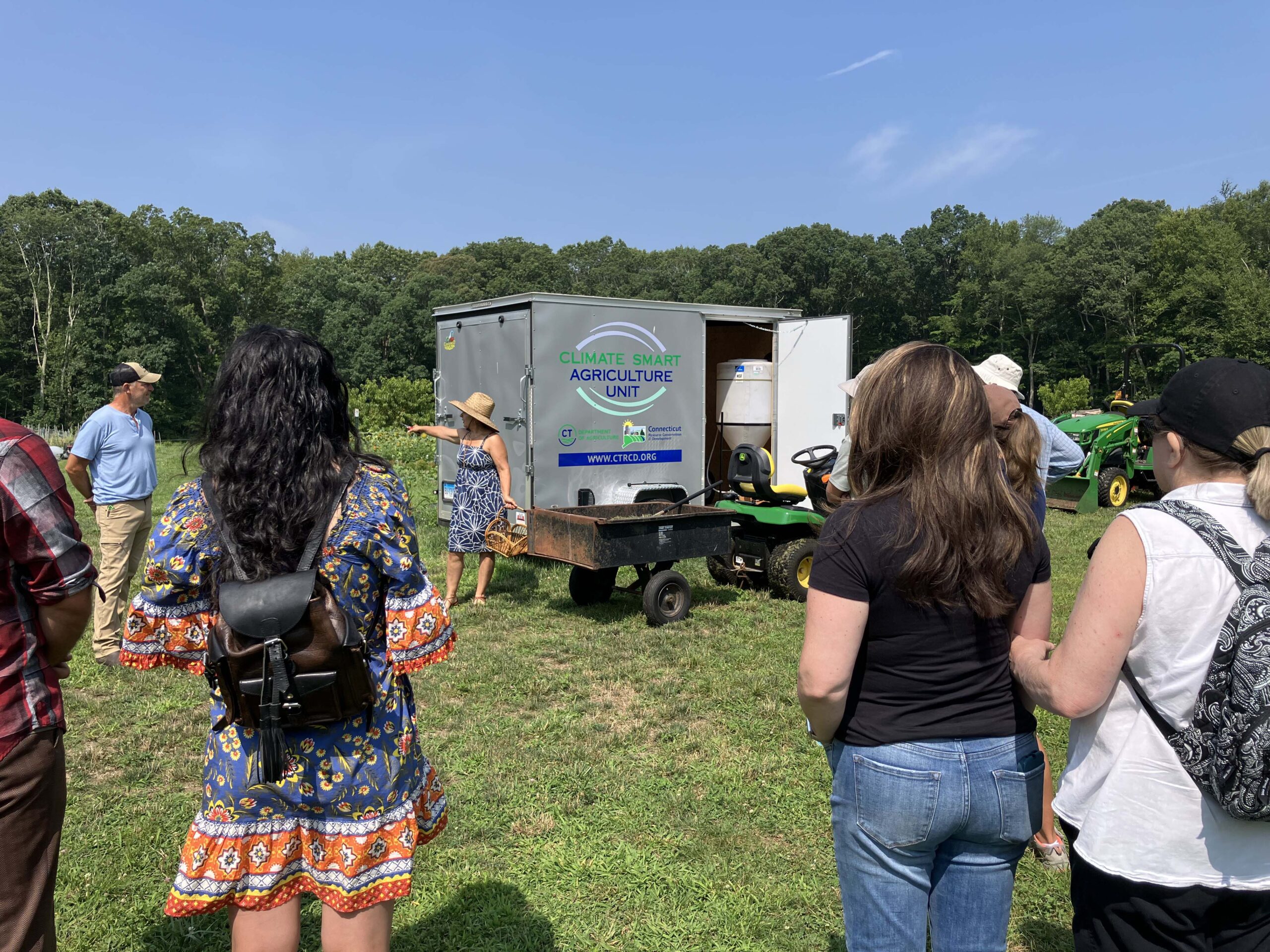 Mia in front of a mobile unit awarded to the farm by the Department of Energy and Environmental Protection. The unit contains a compost tea maker; Mia points to the fields, where an experiment is underway to compare an area where the tea is used with a control area.