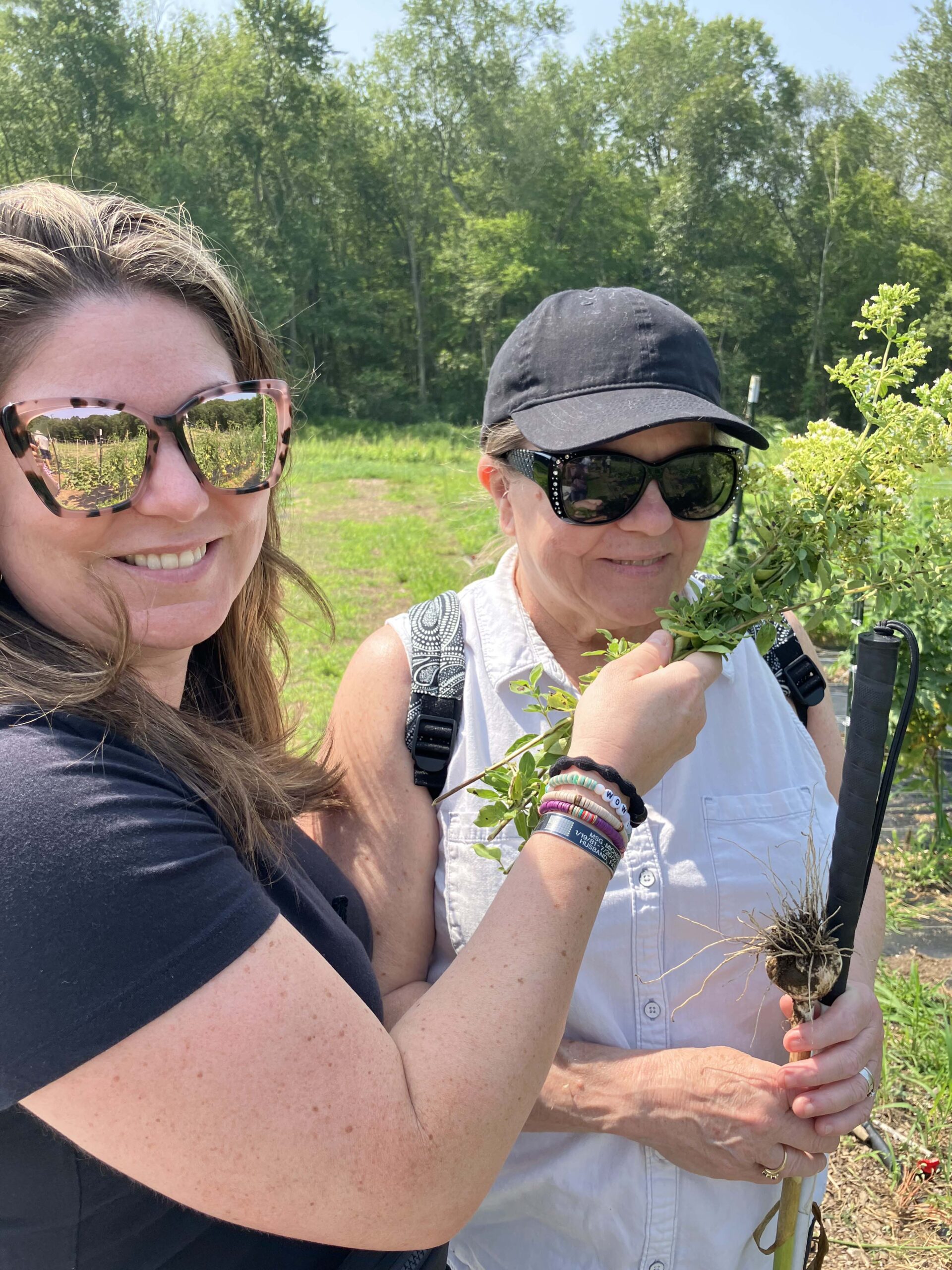 Council member Tammy Paradis about to sniff some herbs held by her daughter, Rachel. (Tammy’s hands hold her garlic plant!)