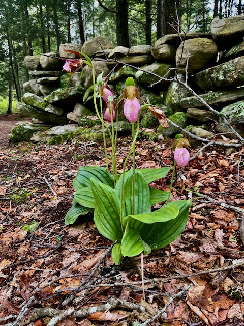But for the present, the photos taken during this field trip moistened by a gentle rain clearly show, the Avalonia Hoffman Preserve, and its inhabitants are thriving. Plant and animal species are diversifying through interventions that were human-initiated or natural. The cleared patch cuts and disrupted logged areas now provide thickets that are cover for birds and bunnies. The tops of Introduced redbuds and loblolly pines poke out above the masses of black birch saplings. And to the distinguished forestry visitors on the field trip, the Hoffman Preserve offered a spectacular springtime show of native pink mountain laurel and fat lady slipper orchids.