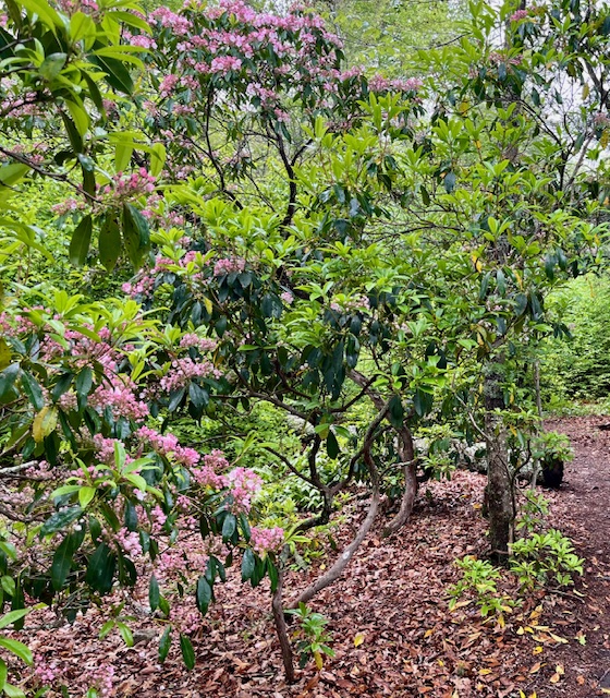 But for the present, the photos taken during this field trip moistened by a gentle rain clearly show, the Avalonia Hoffman Preserve, and its inhabitants are thriving. Plant and animal species are diversifying through interventions that were human-initiated or natural. The cleared patch cuts and disrupted logged areas now provide thickets that are cover for birds and bunnies. The tops of Introduced redbuds and loblolly pines poke out above the masses of black birch saplings. And to the distinguished forestry visitors on the field trip, the Hoffman Preserve offered a spectacular springtime show of native pink mountain laurel and fat lady slipper orchids.