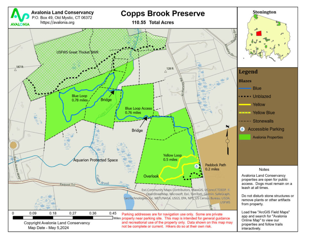 This parcel forms part of the greater contiguous protected area of 235 acres and trails network, which includes the Avalonia owned Copps Brook Preserve (112 acres), the US Fish & Wildlife owned Great Thicket Preserve (103 acres) and the privately owned Merrill-Andrews Conservation Easement (20 acres) which is protected but not open to the public.