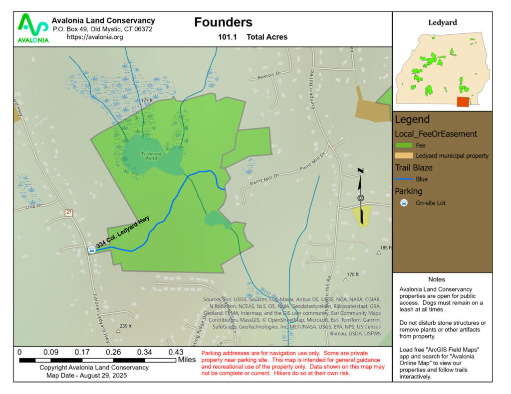 This parcel is the second large parcel recently obtained in Ledyard by Avalonia and contributes to an expanding greenway and blueway north to south and adds to a considerable amount of land previously conserved by Avalonia. This parcel had been trailed with well-maintained paths and wildlife viewing areas and will be retained as such in accordance with a Management Plan to be formalized over the next several months. It will include accessible parking at the primary entrance to the Preserve that will be constructed soon. Appropriate signage will be erected at the entrance to the Preserve. Currently a rough .5 mile farm road serves as a trail to the pond dam location, functioning as emergency and maintenance access.