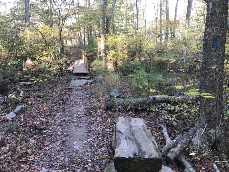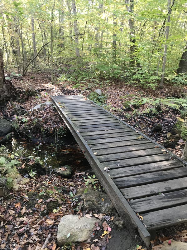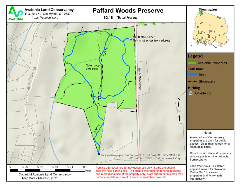 Ample parking with access to a beautiful trail that is a series of two intersecting loops with an additional, off circle trail that is an in-and-out leading to view of water/coastal wetlands.  The largest loop (outer perimeter) is approximately 1.25 miles with a 135 ft elevation gain.  The shorter loop is approximately 0.7 miles with a 80 ft elevation gain.  The off circle/straight in-and-out to the cove is 0.6 miles total (round trip, in-and-out) with a 80 ft elevation gain.  All trails are marked well with blue trail heads and have multiple standalone maps spread throughout the trail (clearly marking and aiding the hiker on their travels).  These trails are packed earth/dirt trails will some exposed rocks and roots to add some challenges.  The trails occasionally pass over streams/creeks and there are occasional glacial erratics/stone walls and wood platform bridges.  The trail is pet friendly (dog on leash), located in Stonington, good for bird watching with occasional ground animals (chipmunks, squirrels, etc.).  Trail width ranges from as small as 1-2 feet to as wide as 15 feet.  While there may be other cars in the parking lot, the trail is diverse and may offer seclusion.