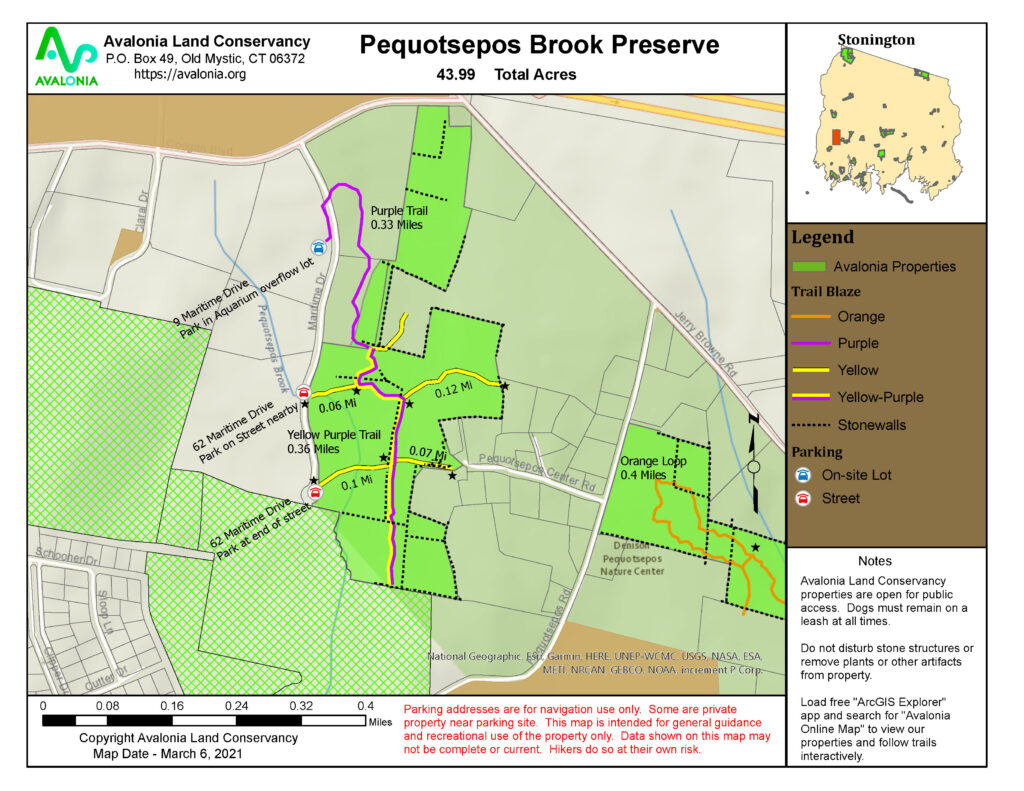 Great network of tails connecting from purple trail across from the Mystic Aquarium (near the West Marine parking lot) in the north, through Avalonia on yellow trails with several spurs, through Denison lands and connecting to the Nature Center’s Coogan Farm trails. The trails continue to Mistuxet Avenue thus creating a large and significant greenway along Pequotsepos Brook.