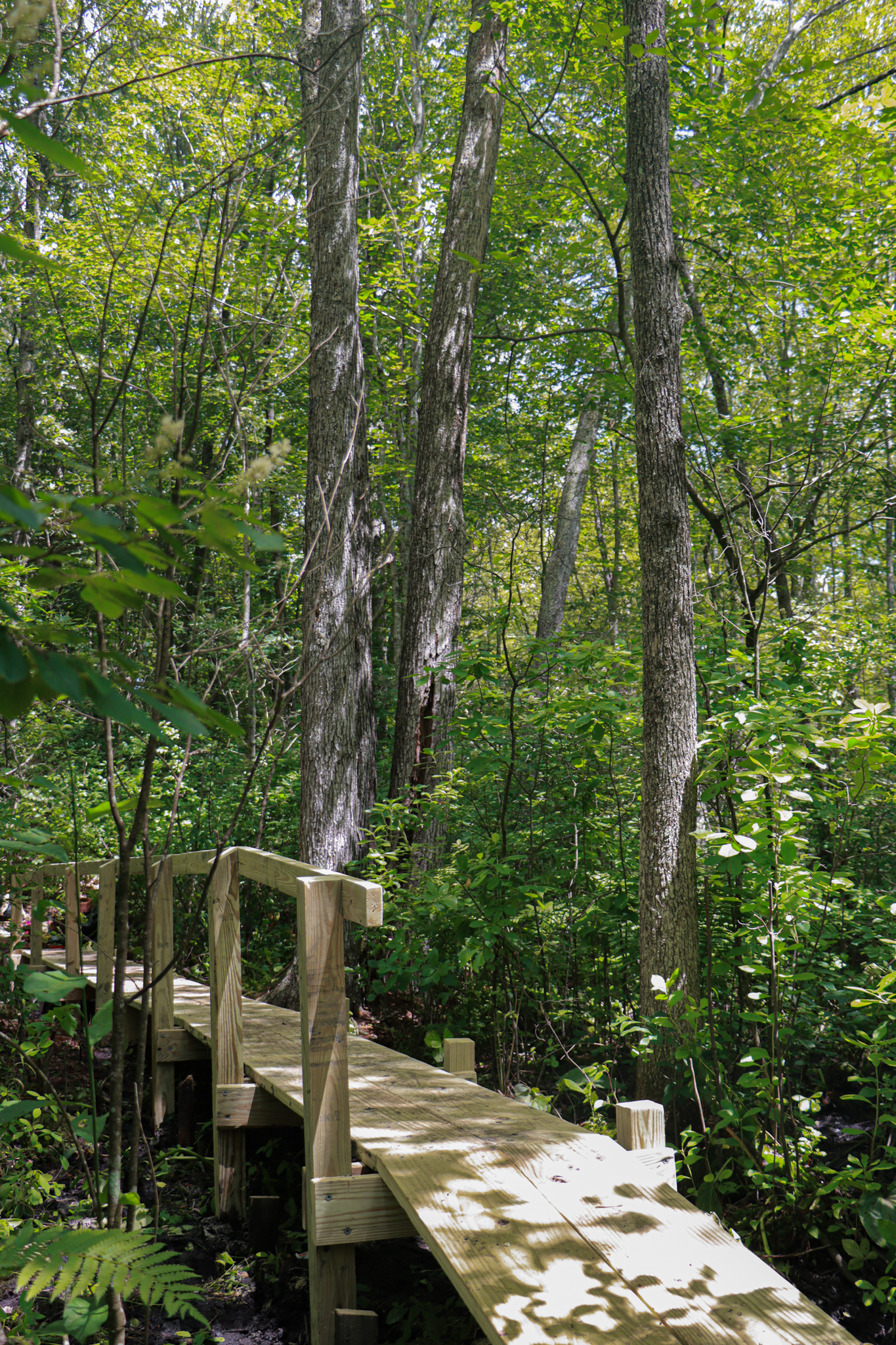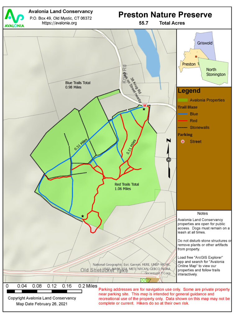 Pulling in through the gate, you are welcomed to a grassy area that has ample parking. The trails are not color-marked, but are clearly evident. There is a bench atop a small hill near the parking area, and another down by the old ice pond, allowing for areas of rest for taking in the beauty of nature. Stone walls are interspersed throughout the preserve, adding historical aesthetics. Note that there is barbed wire along the stone walls; therefore, it is not recommended to get close to the stone walls. Also included on this preserve is a significant swamp. Expect those portions of the trail to be wet at times of heavy rain or snow. There is a new bridge in the swamp which helps, but we recommend a good pair of boots for these portions during wet weather. It dries out to “merely boggy” during the summer dry season. The trail can be as narrow as 2 feet at times or wide open in the grass meadows. Total trail distance is approximately 2 miles with elevation changes of 102 feet. The trails are pet friendly for dogs on a leash.