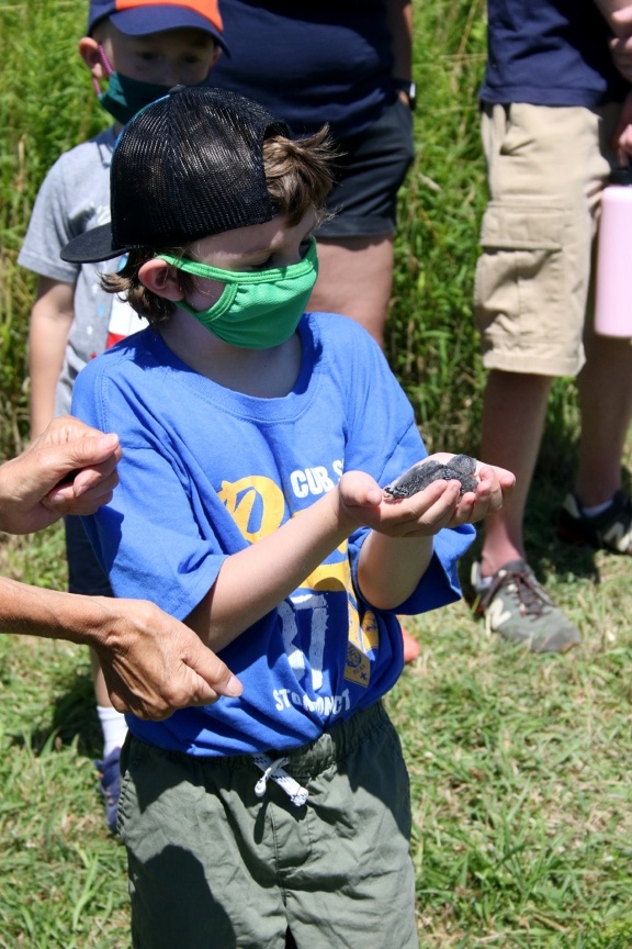 First a discussion about rules: Listening, staying distanced from each other by staying in small family groups, and wearing masks at all times. The kids were great! Despite being obviously excited, each scout carefully ascended the step ladder to view a number of nests through the gourd’s access hole. They were able to observe babies from their first moment of hatching, through various stages, all the way up to ready-to-fledge. Very gently, they were each allowed to hold a young bird, feel its warmth and observe the pin feathers just coming in. They looked at charts together to determine the age of the little birds. Parents had their chance as well.