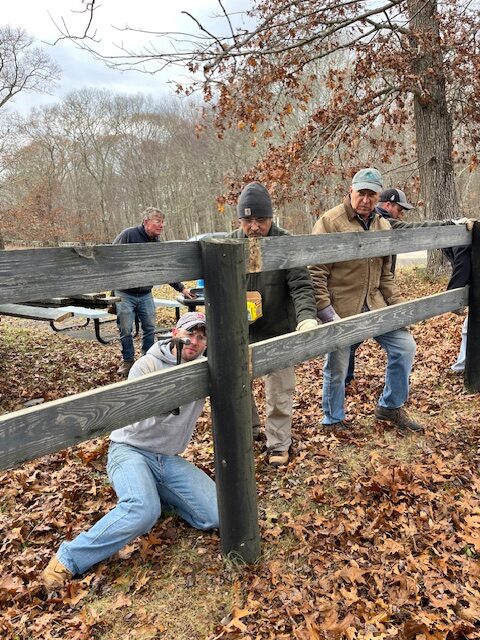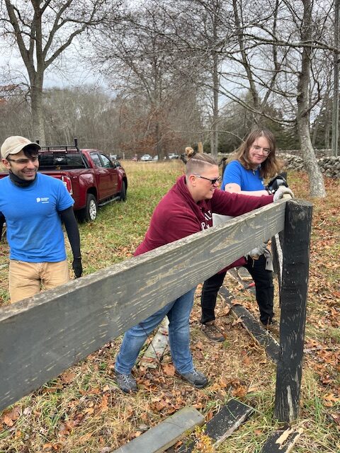 On November 12, 2025, Stonington Town Committee was able to undertake a long-awaited fencing repair project at Copps Brook Preserve on Al Harvey Road. While STC had previously received a grant from the Stonington Garden Club for rental equipment and the purchase of supplies and lumber, it was not until Dominion Energy (Millstone) sent us an able-bodied and hard-working team of 11 volunteers for the day that we got a boost in people-power to initiate the project.