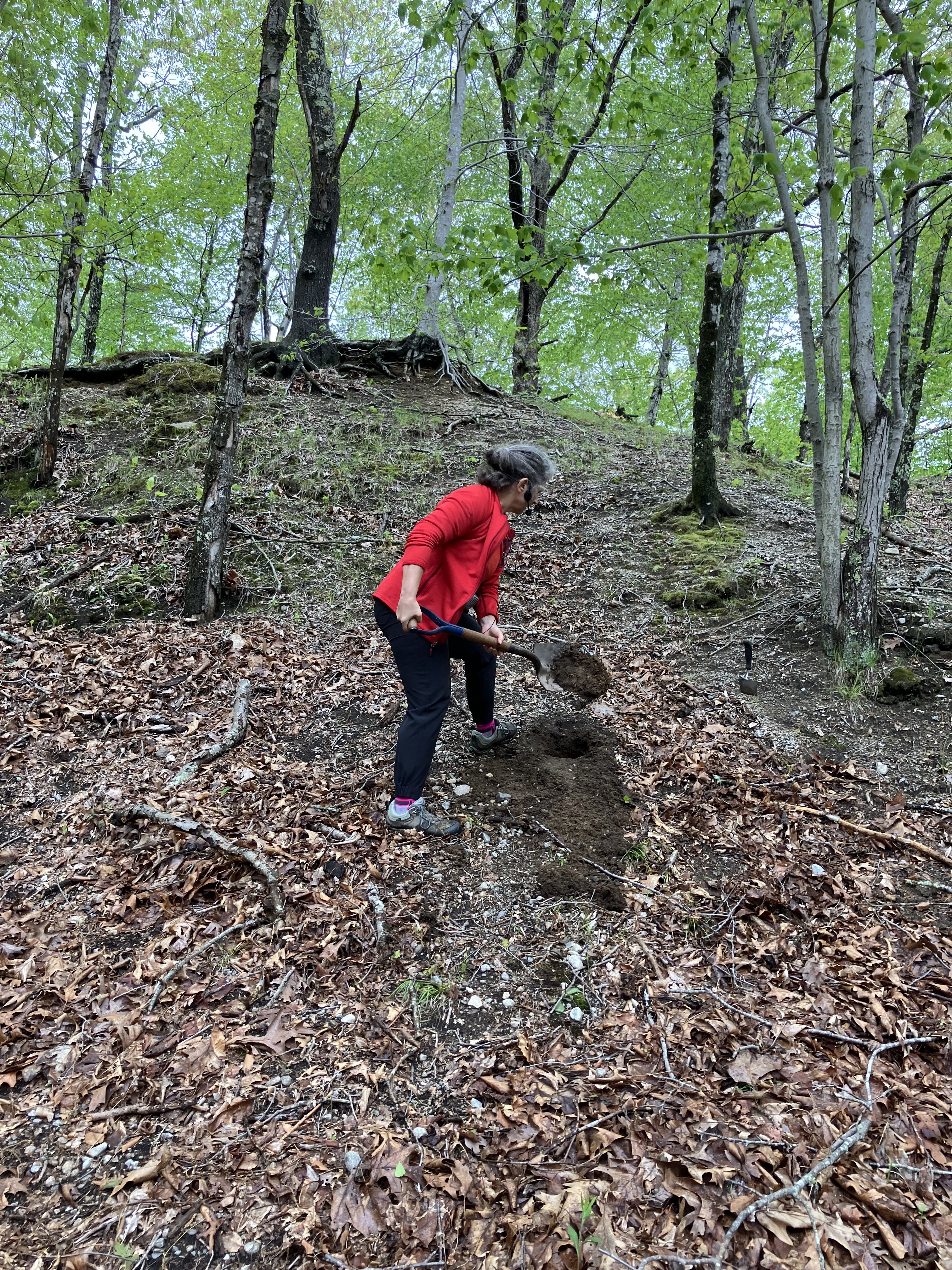 Rocky Road Stroll at Pine Swamp Wildlife Corridor: Mary, who brought digging tools along for the walk, dug into dirt on a hill to illustrate sedimentation. (Mary also illustrated that geology is a labor-intensive pursuit!)