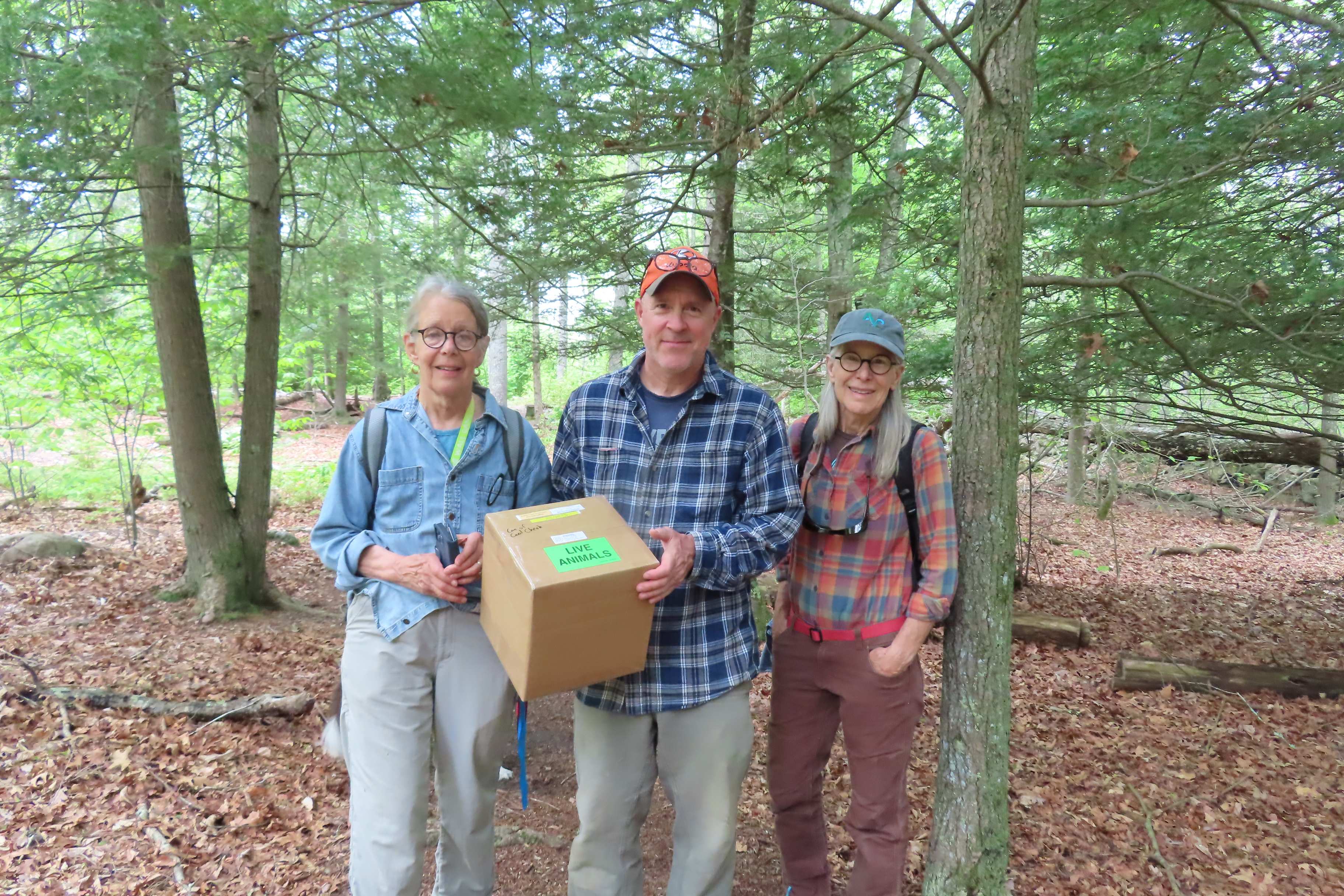During a recent Friday afternoon, three Avalonia volunteers – Beth Sullivan, Nancy Spillane and I – met up with Connecticut Agricultural Experiment Station research scientist Dr. Carole Cheah and her dog Faith at the entrance of Hoffman Evergreen Preserve in Stonington. The reason for the gathering was packed in a medium-sized cardboard box marked “LIVE ANIMALS.”