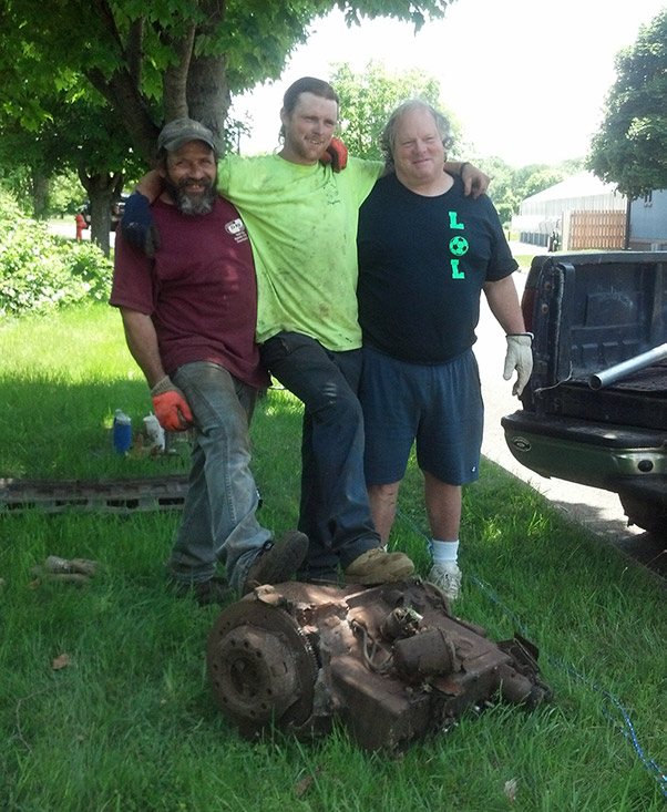 John contacted Paul in June 2013 to ask if he’d be willing to remove the wreck. To his surprise, Paul immediately replied, “Yes! I love Avalonia….You all do great work!” Accompanied by his then 16-year-old son, Jim, and employee Frank Bodolado, aka “Bottlehead,” Paul did the job for free. Avalonia so appreciates Paul’s skill and generosity in tackling a difficult challenge. The pictures and captions tell the remarkable story of the car’s removal.