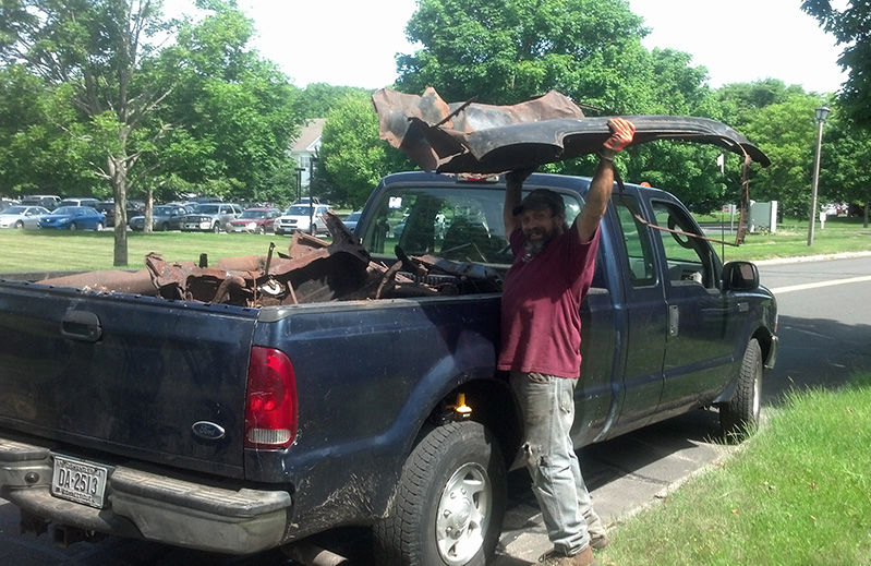 Dean’s is located on Bloomingdale Road in quiet Quaker Hill near Connecticut College. At first glance, the place looked like any other auto parts and recycling operation. Many junked cars, interspersed with a few very classy ones, were parked around the yard. At the back of the lot, a small building housed a counter, a workshop, and a very small office. We were politely escorted a few steps to the office piled high with car parts. Paul greeted us, offered us chairs, and immediately trained his high-speed fan on us while he endured the heat and mopped his brow.